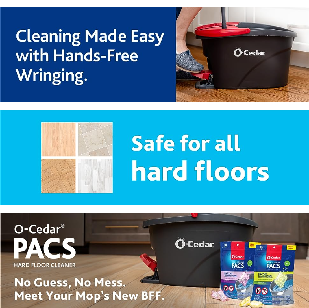 • DEEP CLEANING MICROFIBER: O-Cedar's EasyWring Microfiber Spin Mop & Bucket Floor Cleaning System uses millions of strands of advanced microfiber to effectively capture dirt and grime with just plain water, eliminating the need for harsh chemicals. Safe for all hard flooring, including finished hardwood, wood, laminate, tile, vinyl and more.