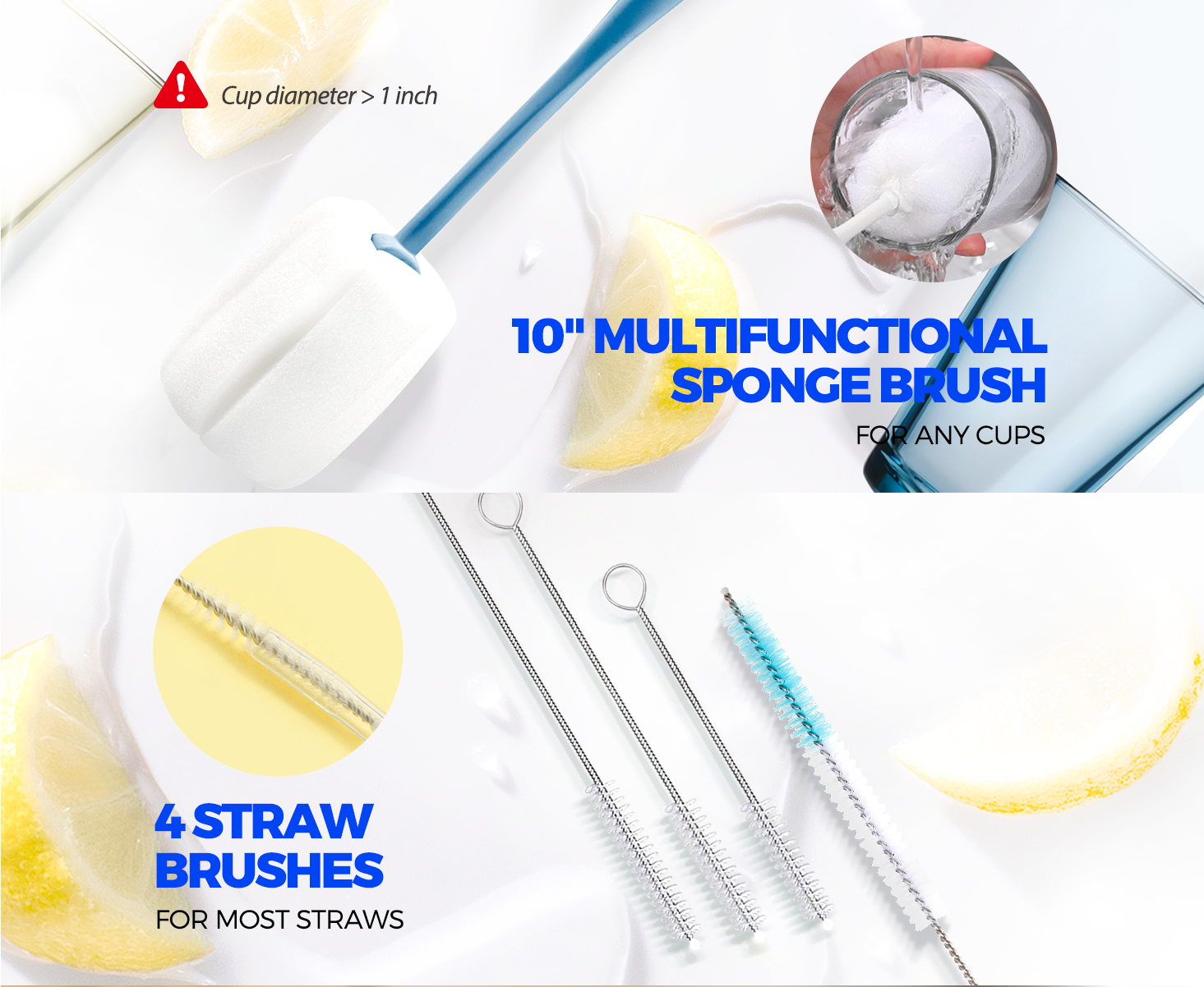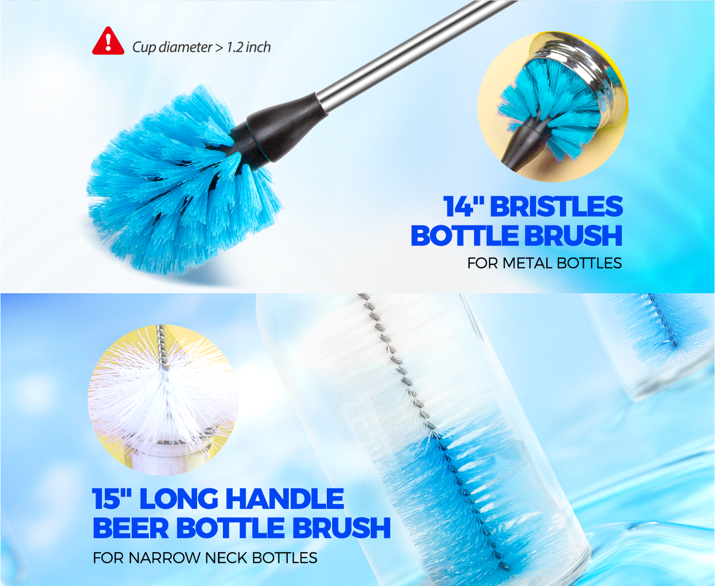 • 🔶8 Pack Bottle Cleaning Brushes, multiple uses, including 15" long handle beer bottle brush, 14" sports water bottle brush, 10" multifunction sponge brush, 4.3" spout cleaning brush, 7.9-12.5" straw brushes. You can hang them on hook for drying and storage.