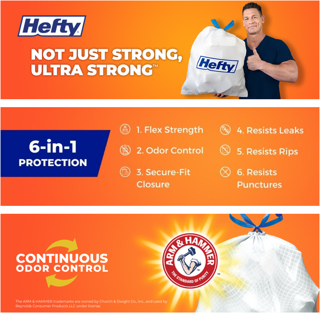• TRIPLE-ACTION TECHNOLOGY—These kitchen garbage bags, stretch and expand to accommodate oversized loads without punctures, leaks or tears