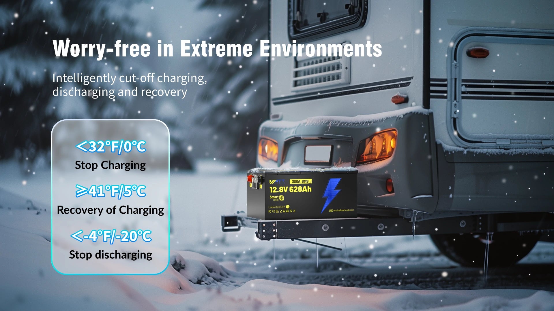 Built to withstand the harshest conditions, the WattCycle 12V 628Ah Ultra lithium battery employs intelligent thermal safeguards that automatically pause charging below 32 °F (0 °C) and only resume once ambient temperatures exceed 41 °F (5 °C). In even more severe cold, discharge is halted below –4 °F (–20 °C) to prevent cell damage. Once the environment returns to safe thresholds, the system seamlessly restores full functionality—ensuring your 12V 628Ah Ultra Lithium Battery delivers uninterrupted power whether you’re braving sub-zero winters or scorching summer heat.