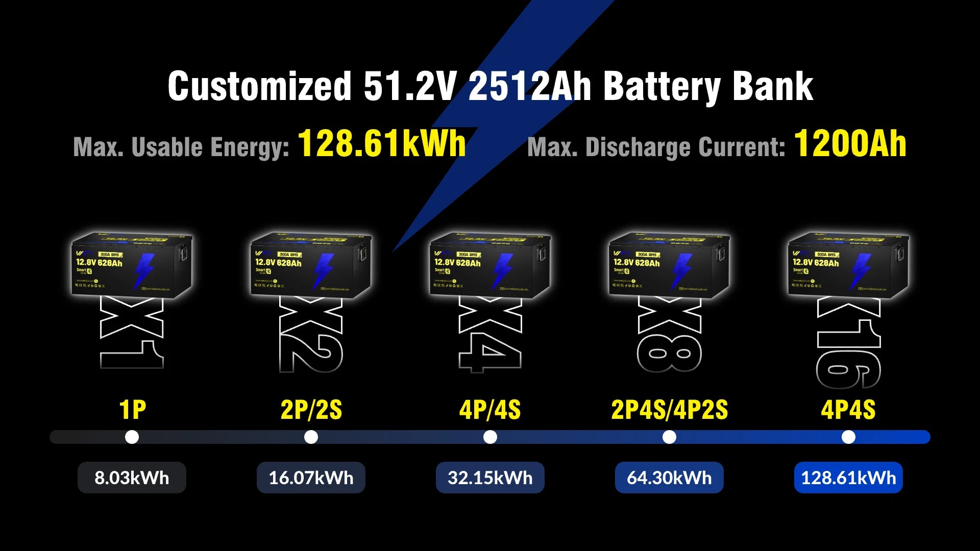 • Plug-and-Play Expansion: Supports 4-series (51.2V) or 4-parallel (2,512Ah) setups for custom energy solutions.