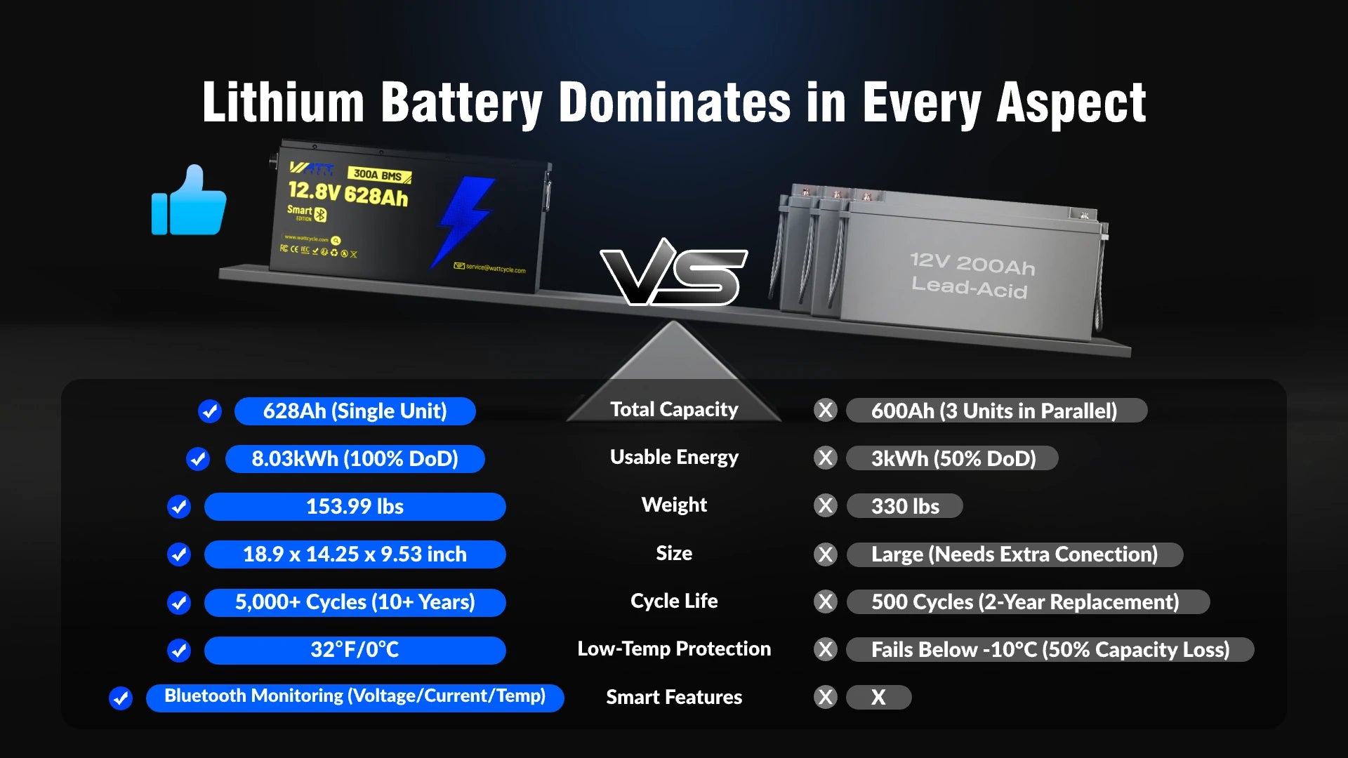 • 3x Lighter Than Lead-Acid: At 115.1 Wh/kg, reduces installation effort and boosts mobility for RVs/boats.