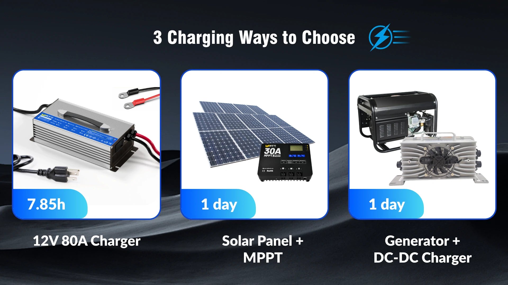 Use the WattCycle 14.6 V 80 A charger specifically designed for LiFePO4 battery, which fully charges the battery in just 7.85 hours. With a faster charging rate than traditional lead-acid batteries it provides a better using experience. In addition, 3 other charging options, including solar panel,  alternator and generator, suit your different charging needs.