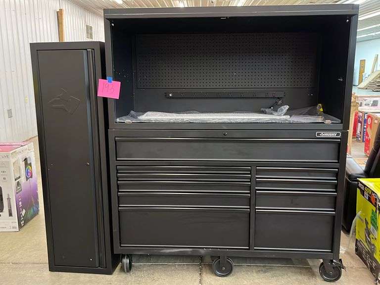 The Husky 80" x 10 Drawer Garage Work Center and Side Storage Unit is a heavy-duty 19-gauge steel 3-piece tool storage unit rated for a 3,000 lb. load capacity. The 24-inch deep garage box features a garage lid that lifts and slides into the top unit, as well as a pegboard and thick mat to provide a large work area. The 3 piece unit also comes with 10 drawers and side storage and has an area of ​​84,025 cubic meters. inches of storage capacity. Drawers come with soft-close slides rated for 120 pounds. Extra-deep bottom drawers and full-length top drawers with dual 120-pound slides provide convenient storage for larger and longer items. Includes premium drawer liners. A built-in full-length power strip includes 8 outlets and 2 USB ports in the top cabinet and 6 outlets and 2 USB ports on the side of the base cabinet, allowing you to easily charge all your tools. Also included is a rechargeable magnetic LED work light. The lamp charges via USB connection, has 3 light modes, a recessed folding hook, and can produce up to 360 lumens. For added security, all 3 pieces feature a barrel key lock system. The side storage cabinets bolt to the sides of the unit and measure 19" wide x 21" deep x 71" high and feature two adjustable shelves. The tool box weighs 711 pounds. The unit has 6 5" x 2" heavy duty industrial grade swivel casters with brakes and 2 non-swivel casters. This 3-piece garage storage unit has a capacity of 3,000 and features side storage cabinets with adjustable shelves.