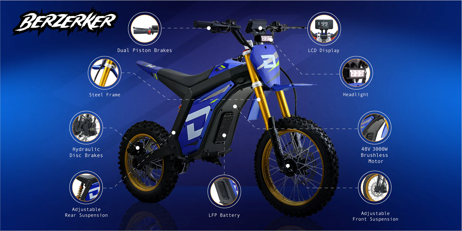 Meet the Berzerker—a ferocious electric dirt bike engineered for thrill-seekers who crave speed and control. With a 3000W peak brushless motor and three speed modes topping out at 37 mph, it’s built to conquer any terrain. Dual hydraulic suspension and disc brakes deliver precision handling and stopping power when it matters most. Backed by a 48V 30Ah battery and a steel frame, the Berzerker powers through 50 miles of pure off-road mayhem.