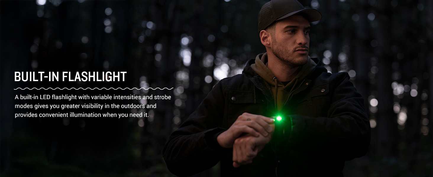 • Built-in LED flashlight with variable intensities and strobe modes gives you greater visibility in the outdoors and provides convenient illumination when you need it