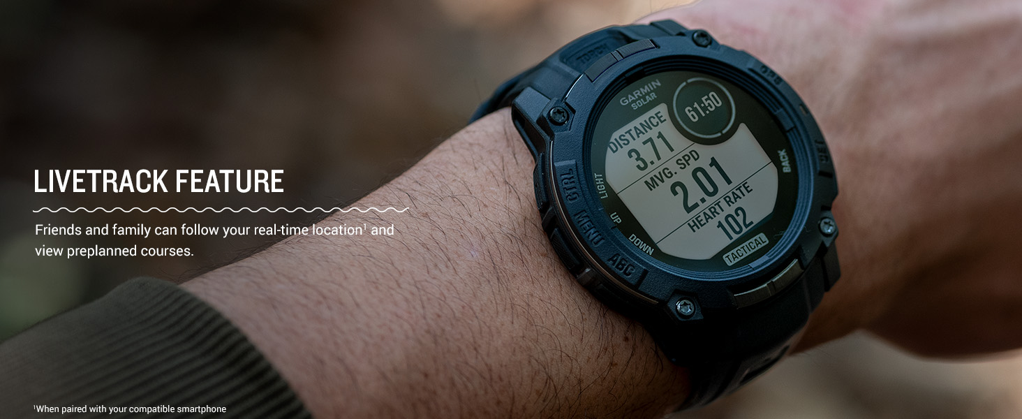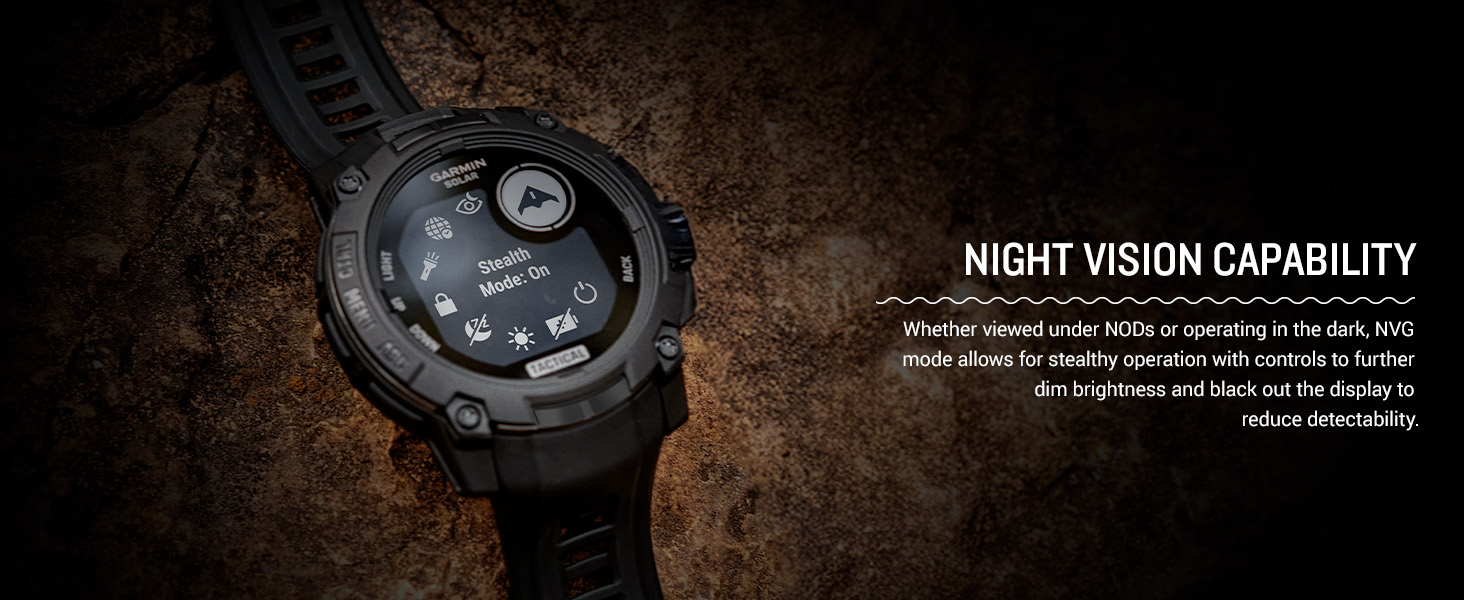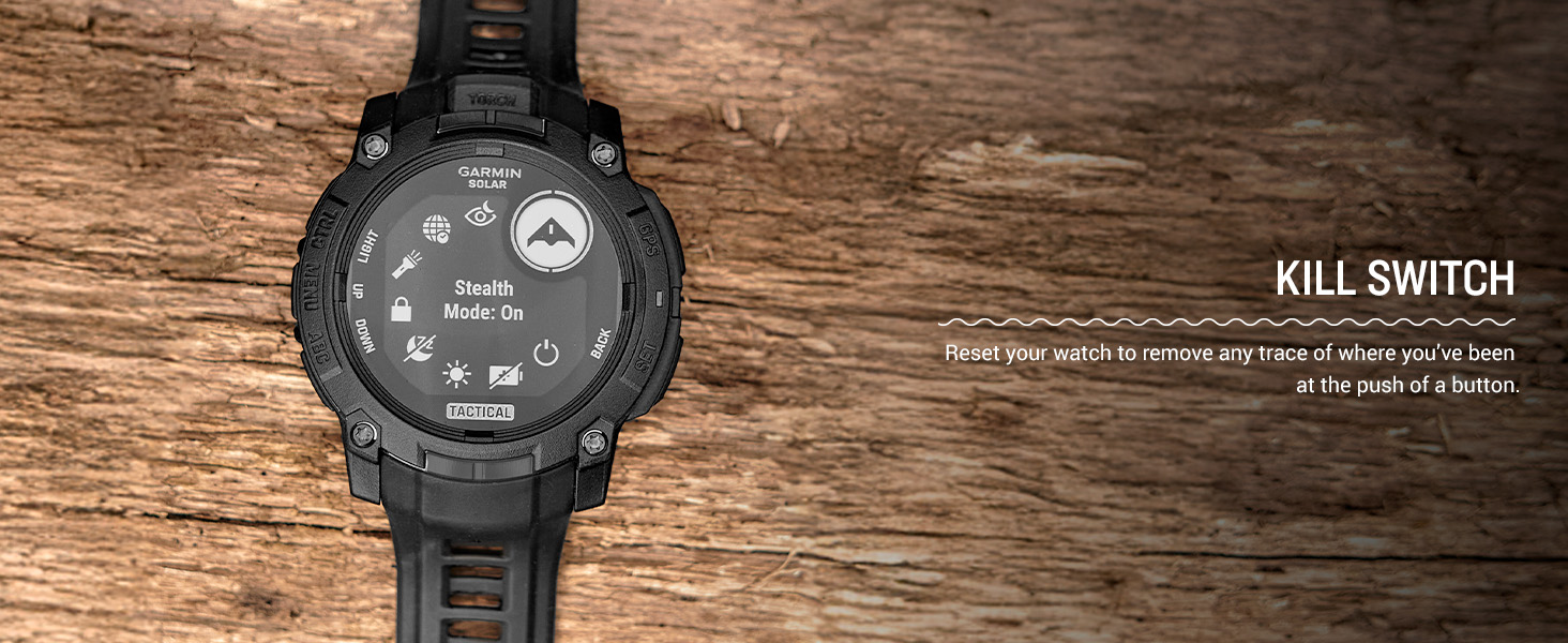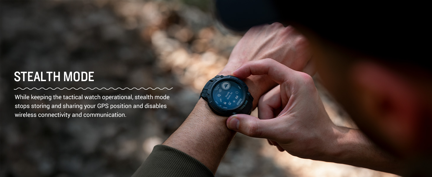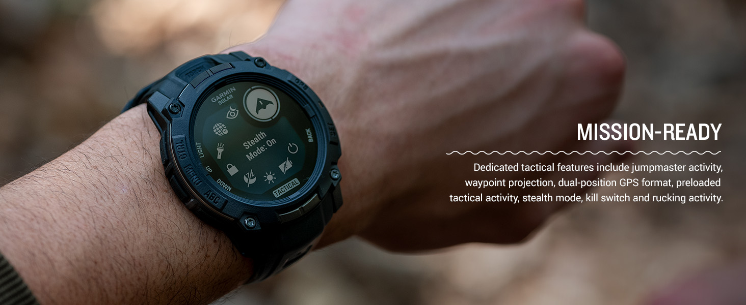 • Dedicated tactical features include jumpmaster activity, waypoint projection, dual-position GPS format, preloaded tactical activity, stealth mode, kill switch, compatibility with night vision goggles and a rucking activity