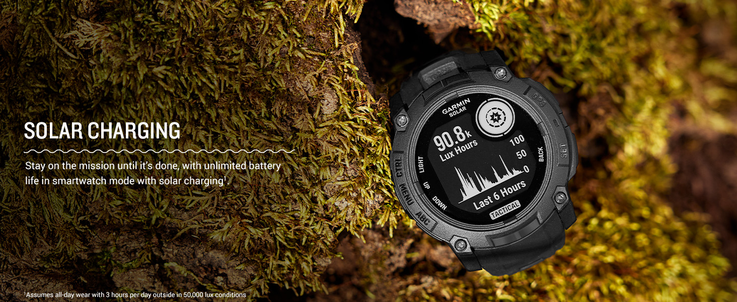 • Lead the mission with this rugged GPS smartwatch, featuring solar charging for unlimited battery life in smartwatch mode (assumes all-day wear with 3 hours per day outside in 50,000 lux conditions)