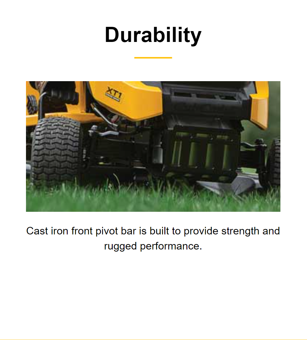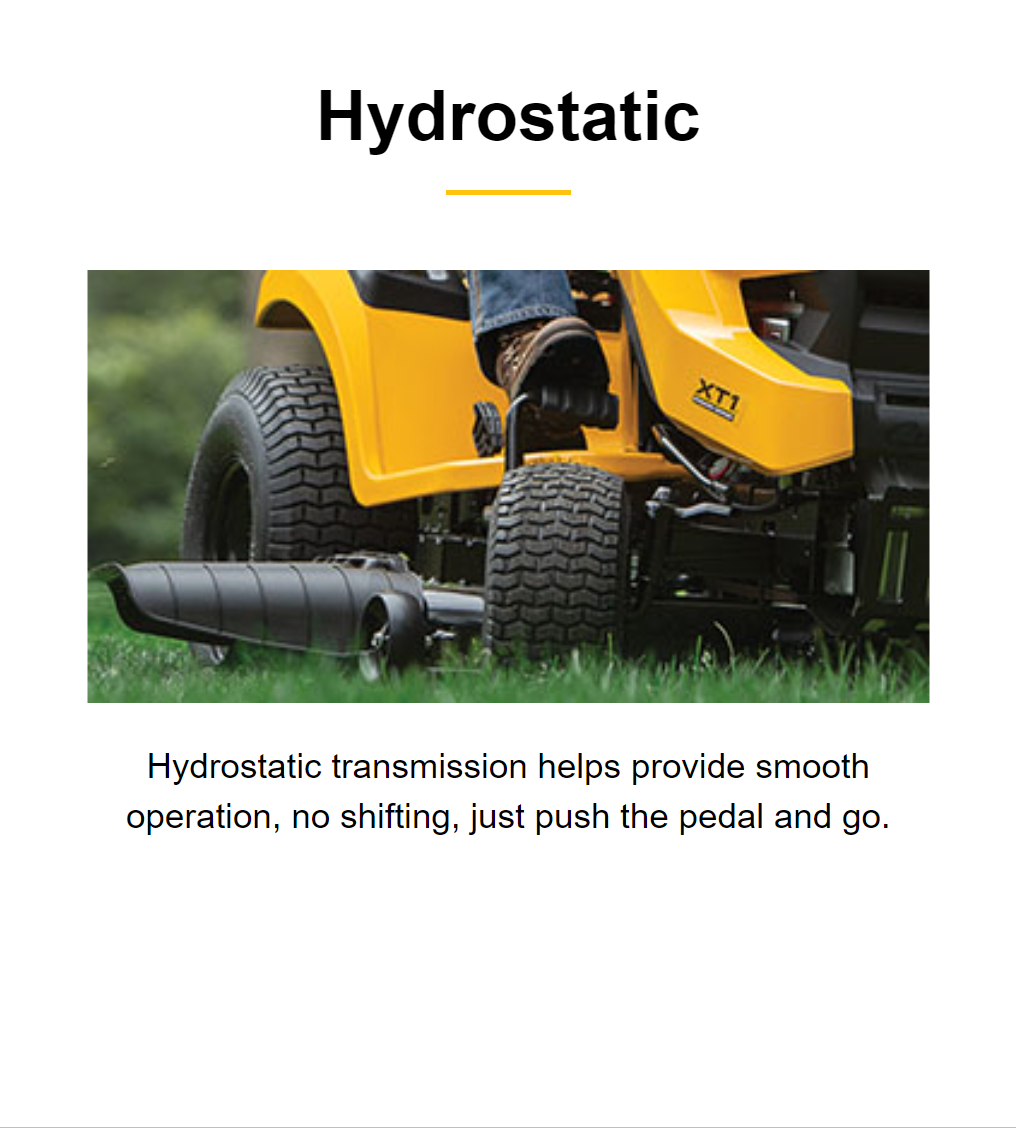 The Cub Cadet® Enduro Series XT1 ST54 is a riding lawn mower with a 54-inch AeroForce™ fabricated deck and a powerful 24 HP engine. It is designed to give you a high-quality cut with minimal clumps and uneven patches. The mower features a hydrostatic transmission for smooth operation. Additionally, it has a comfortable 15-inch high back seat that can be adjusted, ensuring a great mowing experience.