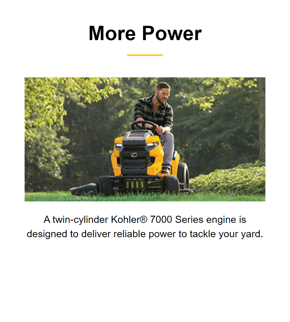• HorsepowerAs rated by Kohler®, all power levels are stated in gross horsepower at 3600 RPM per SAE J1940 as rated by engine manufacturer.